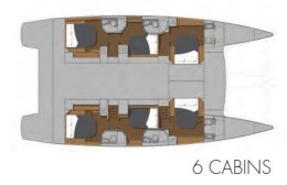 Der Fountaine Pajot Ipanema 58 ist in jeder Hinsicht ein beeindruckender Katamaran. Unter Segel ist die Aussicht von der Flybridge atemberaubend. Es ist eine eindrucksvolle Kombination aus Innovation und Designbrillanz und bietet eine erstaunliche Fülle an Wohnflächen im Innen- und Außenbereich. Die Flybridge ist vom Achterdeck aus leicht zugänglich und verfügt über große Sonnenpolster, einen geschützten Steuerstand, Lounges und Tische für ein gemütliches Beisammensein. Das geräumige 25m² große Cockpit der Ipanema 58 integriert nahtloses Wohnen im Innen- und Außenbereich und bietet eine Fülle von Lounge-Sitzen, einen großen Essbereich und einen geschützten Liegebereich, ideal zum Entspannen mit einem Buch. Das Foredeck ist ein weiterer angenehmer Rückzugsort mit seinen doppelten Entspannungsstationen, die Ruhe und eine herrliche Aussicht versprechen. Im Inneren ist die Ipanema 58 dank der großen Fenster im Salon und in den Kabinen hell und luftig. Der Hauptwohnbereich hat einen offenen Salon neben der modernen Küche. Die Ipanema 58 verfügt über 6 Gästekabinen, jede mit eigenem Bad mit Dusche und WC. Die Crew hat eine eigene Kabine und ein eigenes Bad.