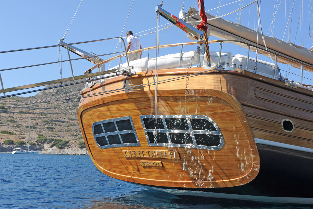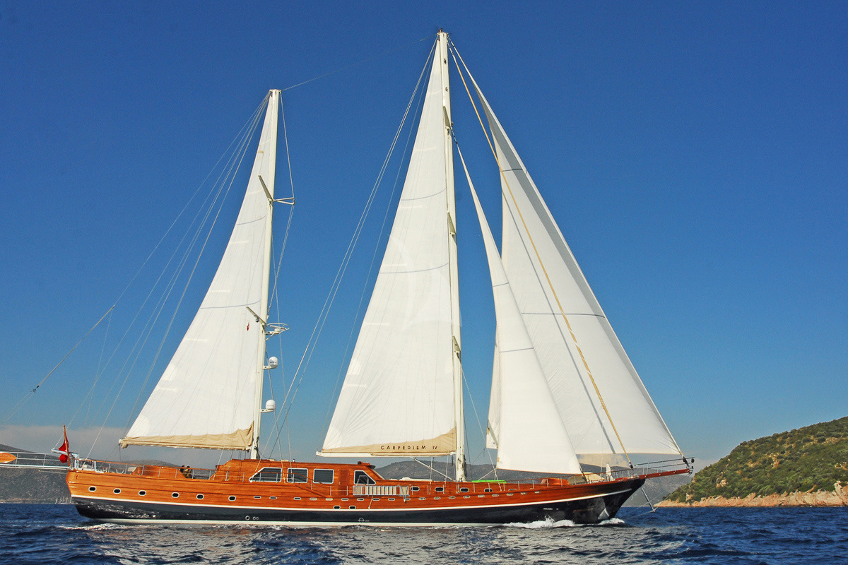 Die Segelyacht CARPE DIEM IV ist ein 47 m wunderschönes Schiff, das auf höchstem Niveau gebaut und 2011 in Betrieb genommen wurde. 6 Kabinen, darunter 2 große Master-Schlafzimmer, 2 Doppelzimmer und 2 Zweibett-Kabinen, jede mit SAT-TV, iPod-Station und eigenem Bad. Die Achterkabine ist mit großen Fenstern am Heck ausgestattet, während die vordere Masterkabine eine Sauna beinhaltet. Carpe Diem IV verfügt über einen Holzrumpf und einen Aufbau mit Aluminimmasten und ist die größte bisher in der Türkei gebaute Holzyacht. Carpe Diem IV wird von einer professionellen und erfahrenen 7-köpfigen Crew geleitet, die Ihnen wunderbare Segeltörns entlang der schönen südlichen türkischen Küste oder zu den griechischen Inseln bieten wird.