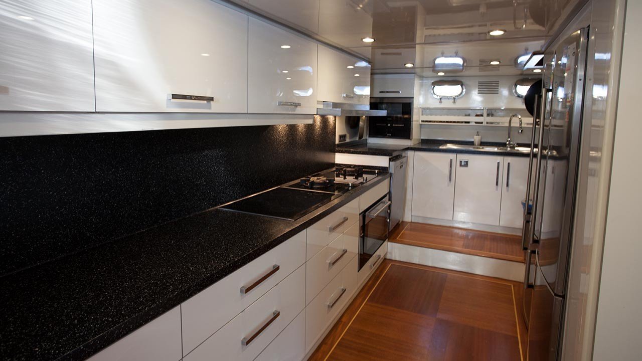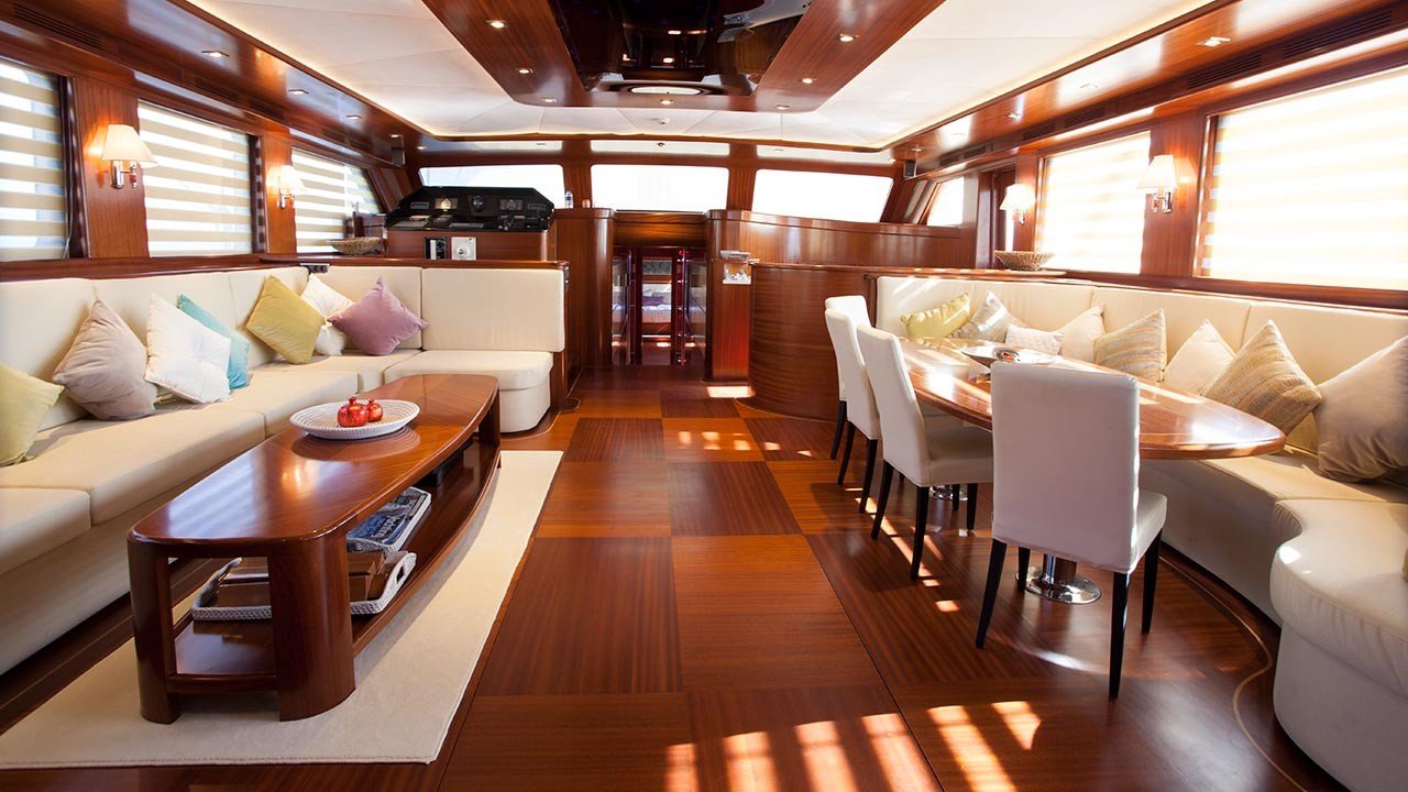 Ihre Innenräume aus Mahagoni mit Marmorbädern und luxuriösen Polstern beinhalten einen Innenraumsalon und ein Esszimmer. Auf der Außenseite ist das Achterdeck mit einem Ess-, Bar- und Liegebereich im Freien ausgestattet, während das große Vorderdeck komfortable Liegeflächen bietet. Ein Sonos Soundsystem innen und außen mit einer Musikbibliothek und mehreren Wasserspielgeräten steht zur Verfügung, um Sie während Ihres Aufenthalts an Bord der Carpe Diem IV zu unterhalten.