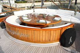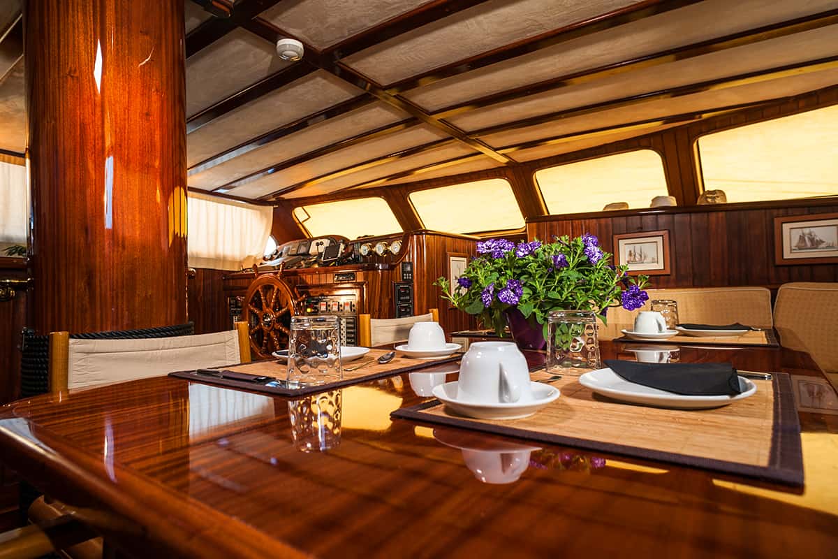 Luxus Gulet ANGELIQUE hat einen eleganten Salon mit Bar und Plasmafernseher. Ein schön veredelter Innenraum aus Mahagoni. Die Gäste können einen großen Außenraum zur wohlverdienten Entspannung genießen, im Cockpitbereich befindet sich ein Tisch für unvergessliche Mahlzeiten im Freien. Zur Bordunterhaltung gehören die Möglichkeit zum Schnorcheln, Tauchen und Wasserskifahren.