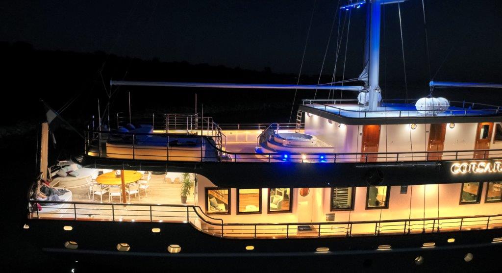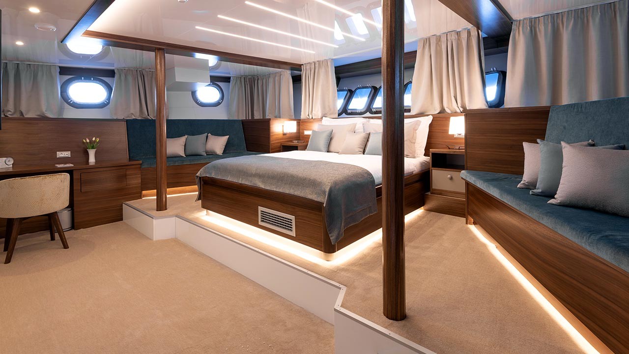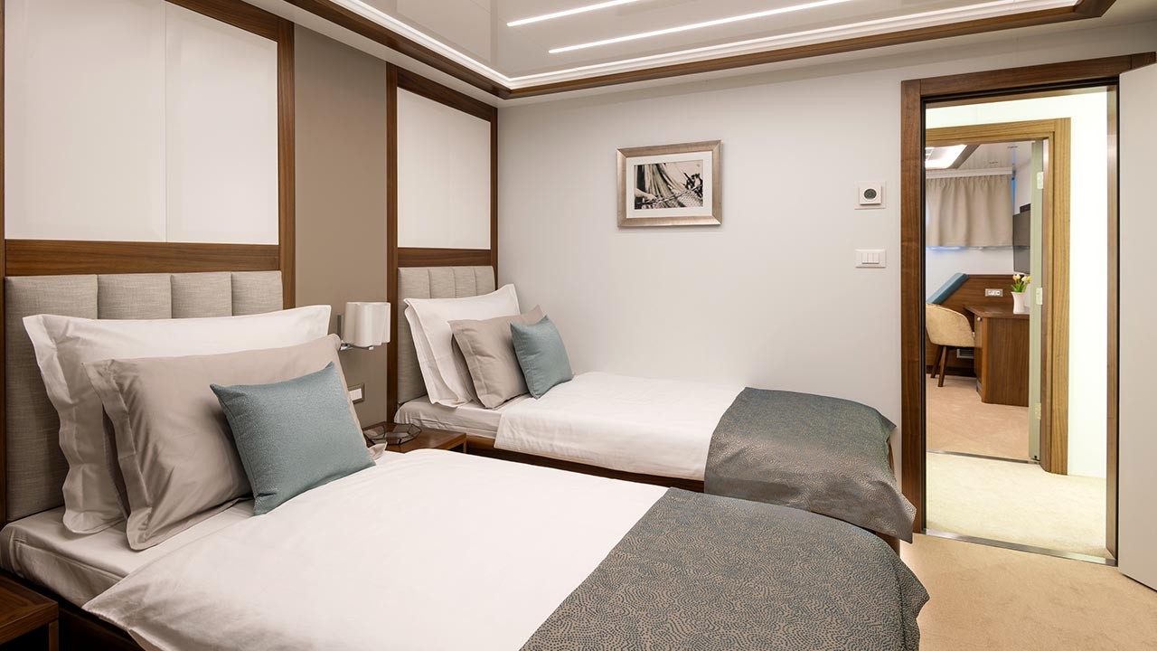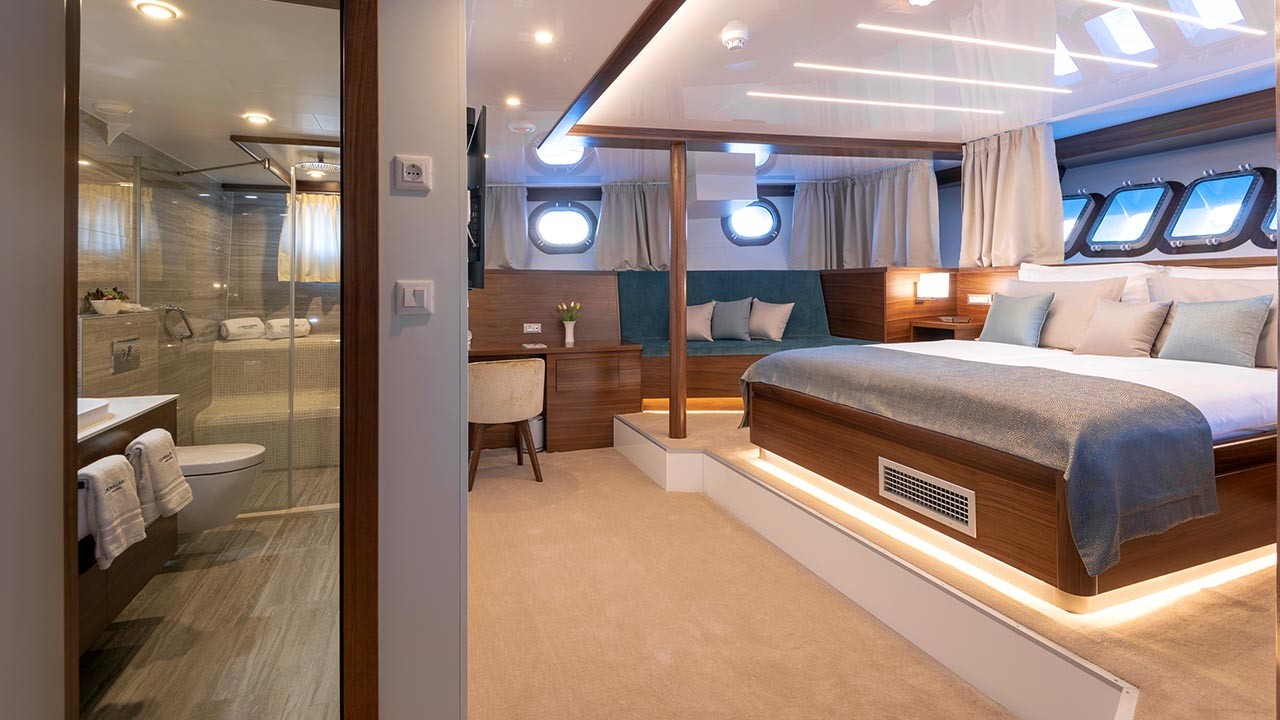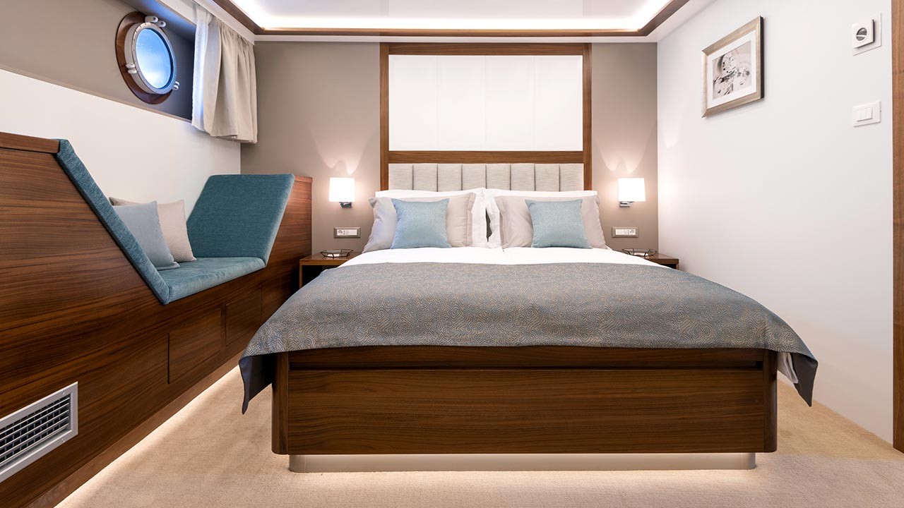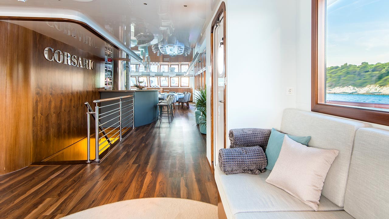 Luxusyacht CORSARIO verfügt über 2 Master-, 2 Doppel-, 2 Twinkabinen, wobei jede Kabine mit eigener Dusche und WC sowie Klimaanlage ausgestattet ist. Alle Kabinen verfügen über TV, DVD und Musikanlage. Mit seinem modernen und herausragenden Innenbereich sowie den Unterhaltungsmöglichkeiten an Bord, den 6 Deluxe-Zimmern der Yacht und einem qualifizierten 8-köpfigen Team bietet die Yacht einen perfekten Urlaub an der kroatischen Küste oder jedem anderen Ziel.